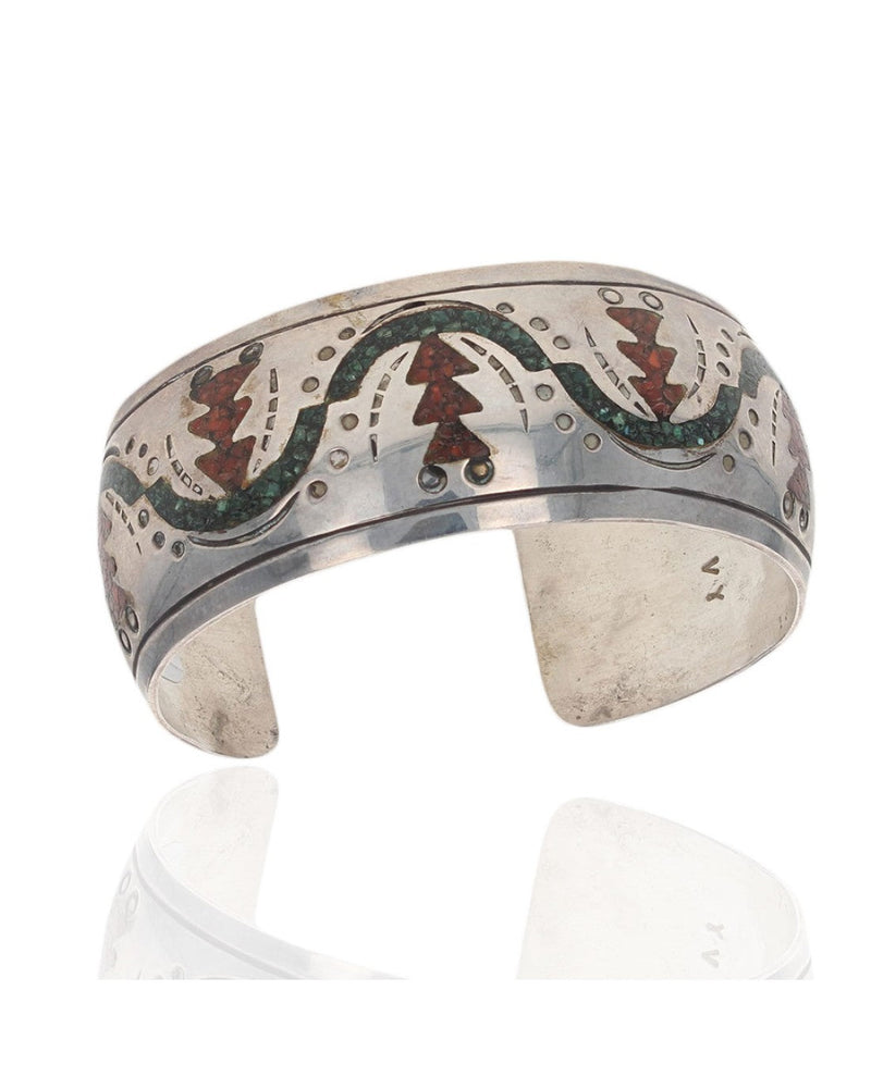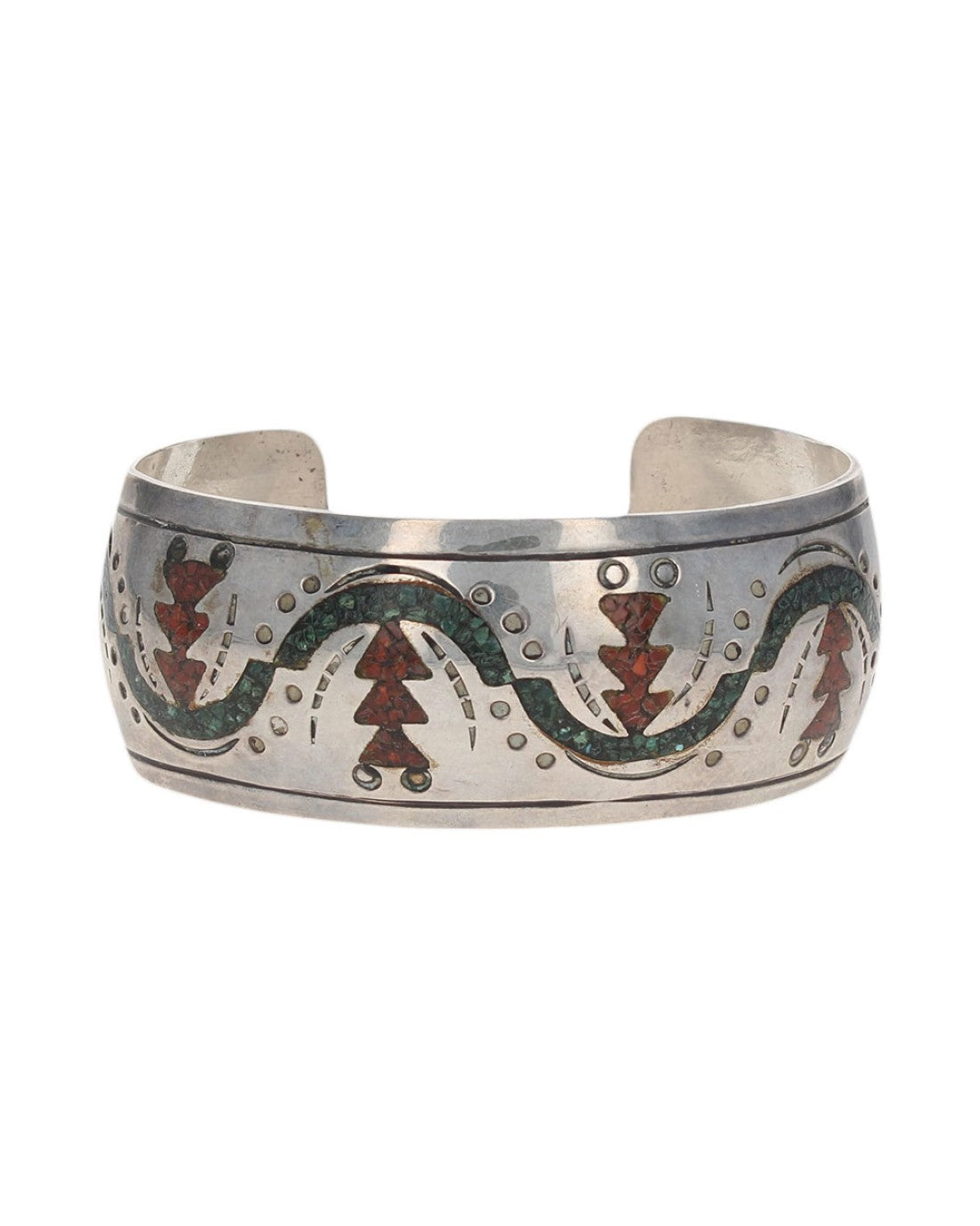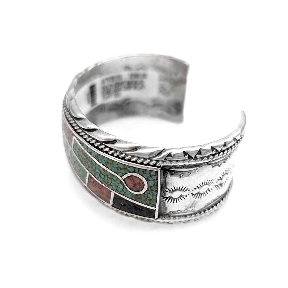 Navajo Delvin Nelson Sterling Silver Turquoise & Coral Chip Inlay Bracelet