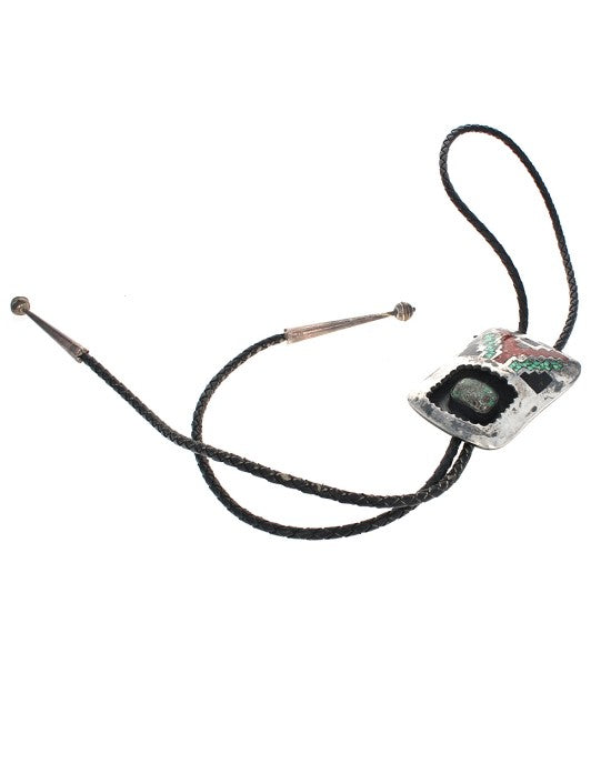 Navajo Annie Chapo Sterling Silver Turquoise & Coral Chip Inlay Bolo Tie