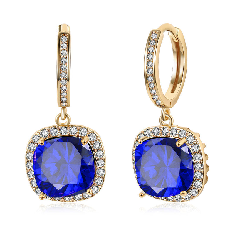 Blue Crystal Asscher Cut Halo Drop Earrings in 18K Gold Plating