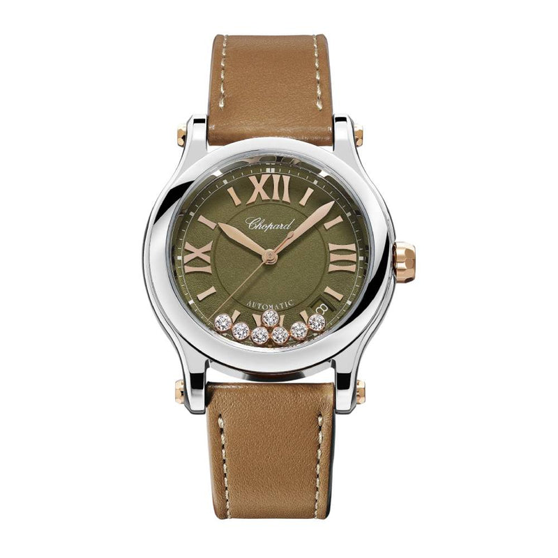 2025 Model Chopard Happy Sport 36 mm Watch - Ref: 278559-6028 - Khaki Green Dial in 18k Rose Gold and Stainless Steel Case, Brown Calfskin Leather