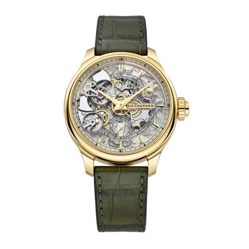 2025 Model Chopard L.U.C Full Strike Revelation 42mm Watch - Ref: 161947-0002 - Openworked Sapphire Dial in 18k Yellow Gold Case, Green Leather