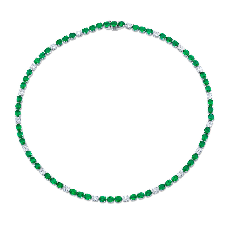 Alternating Oval-cut Diamonds and Green Emeralds Necklace