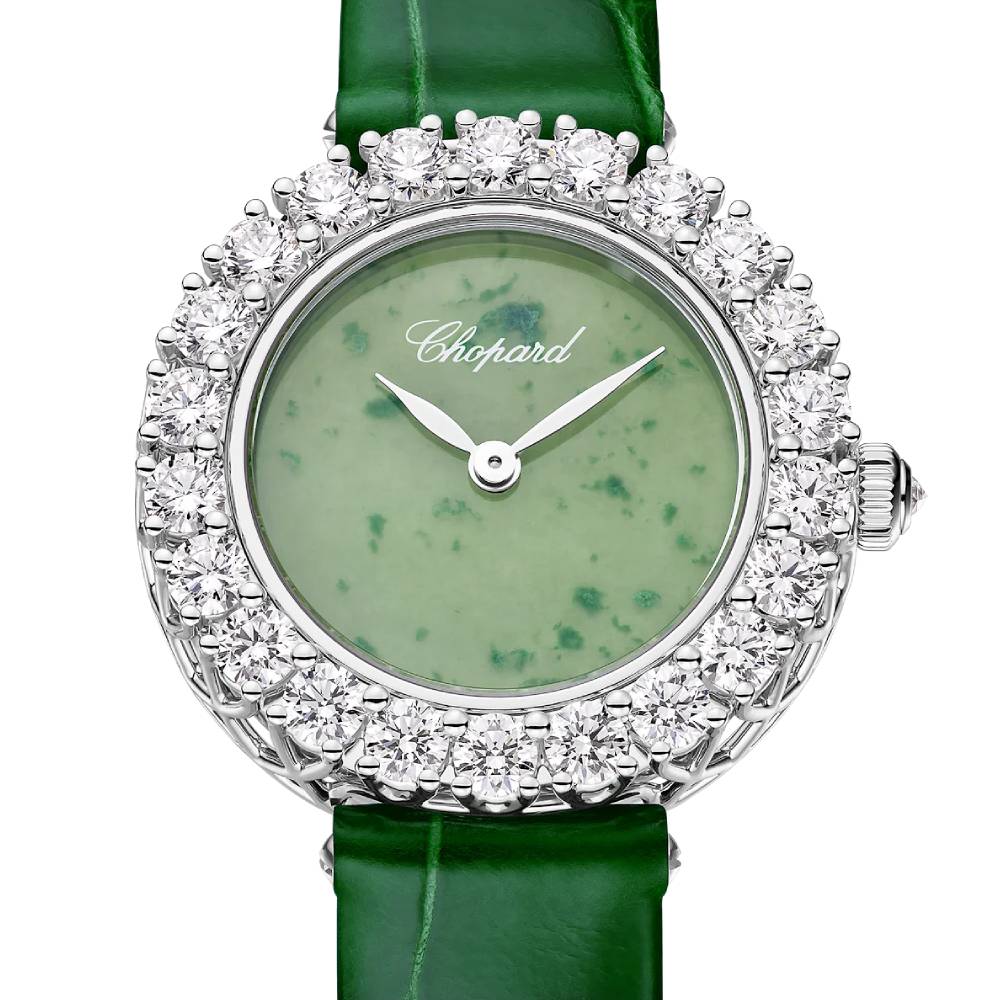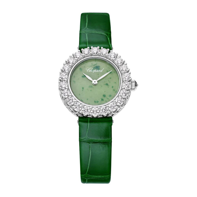 2025 Model Chopard L'Heure Du Diamant Round 26 mm Watch - Ref: 13A178-1310 - Green Dial in 18k White Gold Case, Green Leather Strap