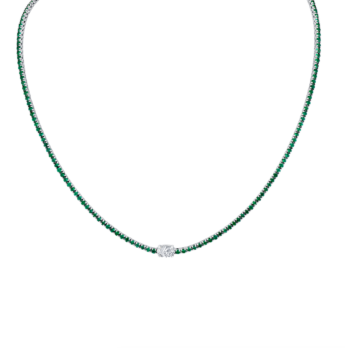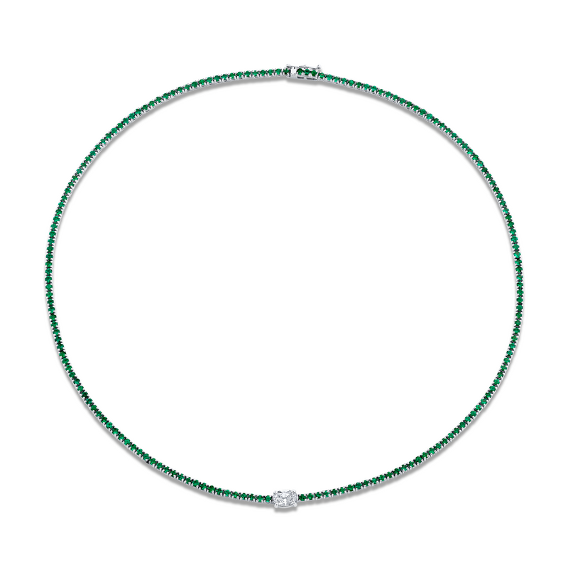 5.49 Carat 18k White Gold Green Emerald Oval Center Stone Necklace