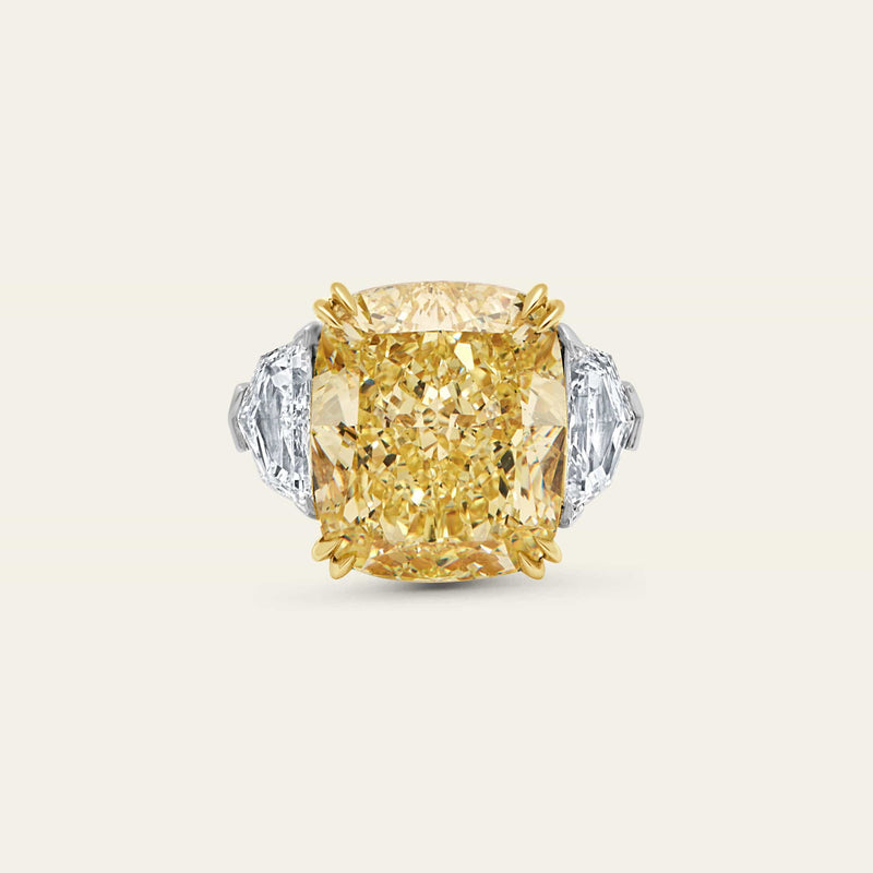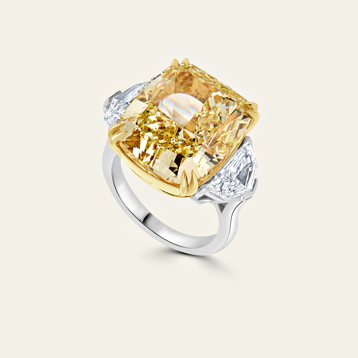 18.88 Carat Radiant Fancy Intense Yellow Diamond 3-stone Ring
