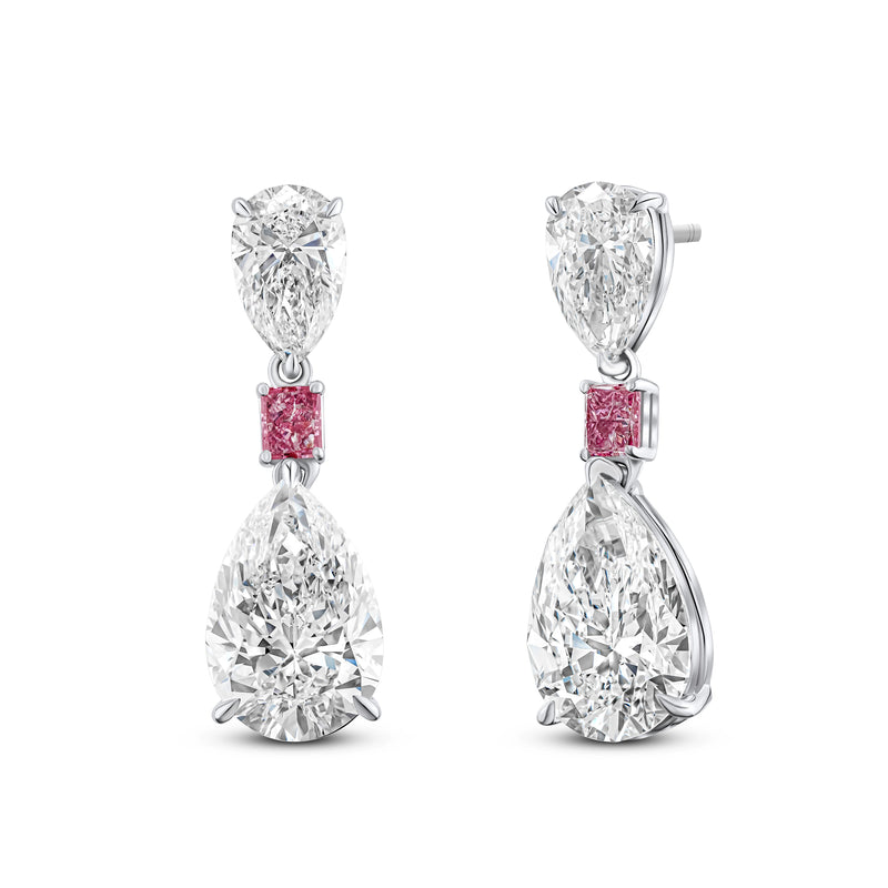 Pear Diamond and Pink Radiant Diamond Drop Earrings