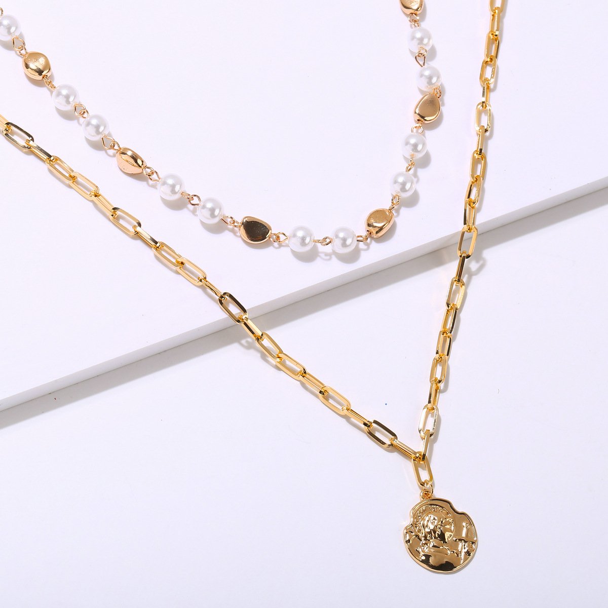 2 Piece Pearl Coin Head Necklace 18K Gold Plated Necklace