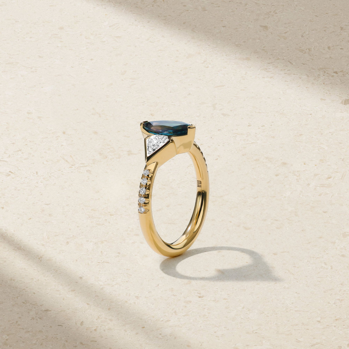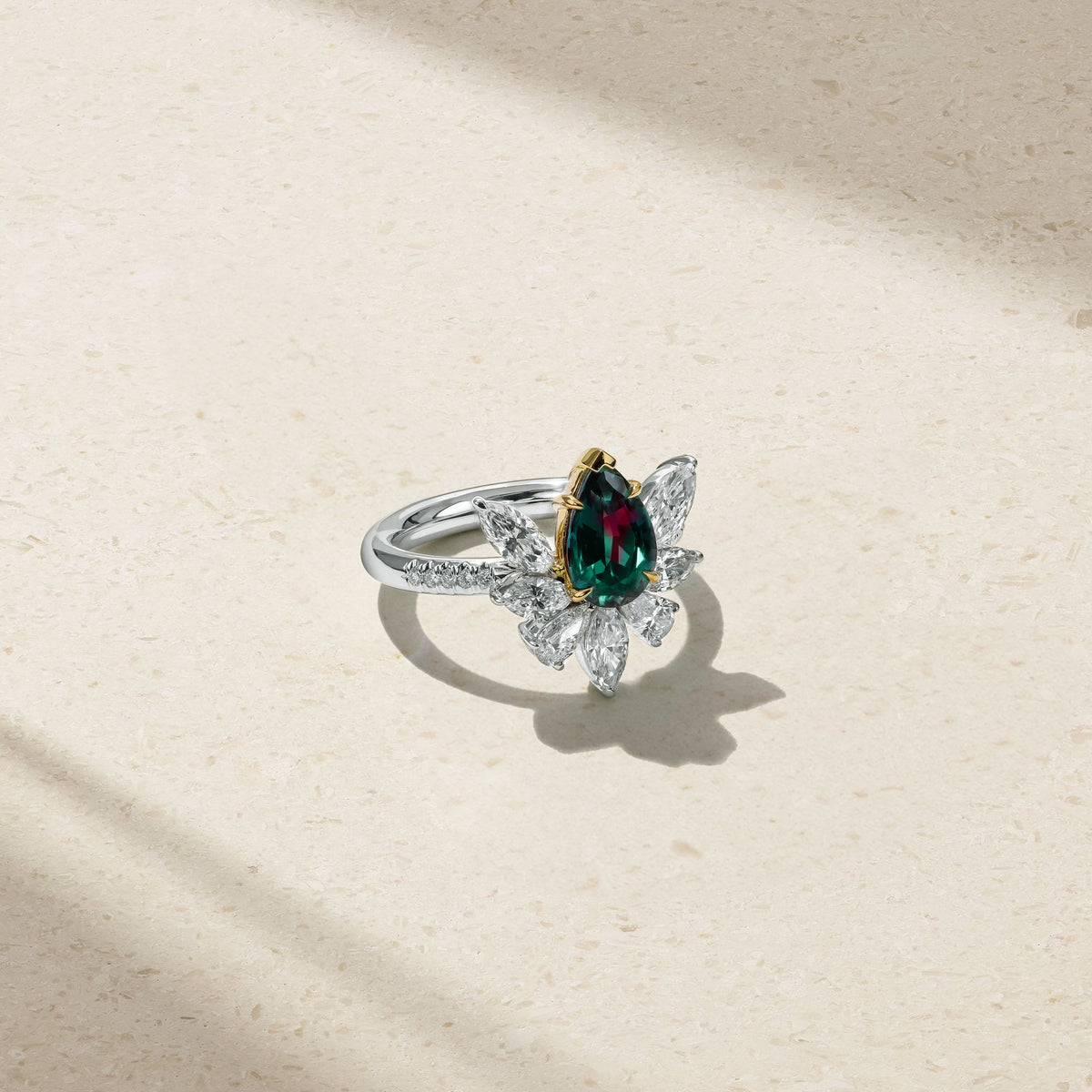 Nouveau Three Stone Alexandrite and Shield Diamond Ring