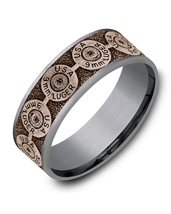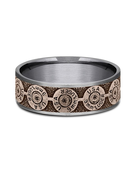 Gentlemen's 9mm Luger Bullet Back Comfort Fit Band in Tantalum and Rose Gold