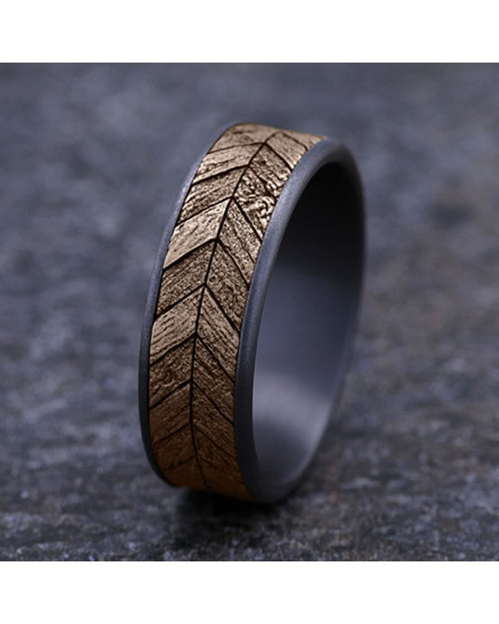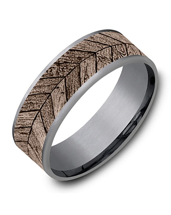 Gentlemen's Chevron Wood Pattern Comfort Fit Band in Tantalum and Rose Gold