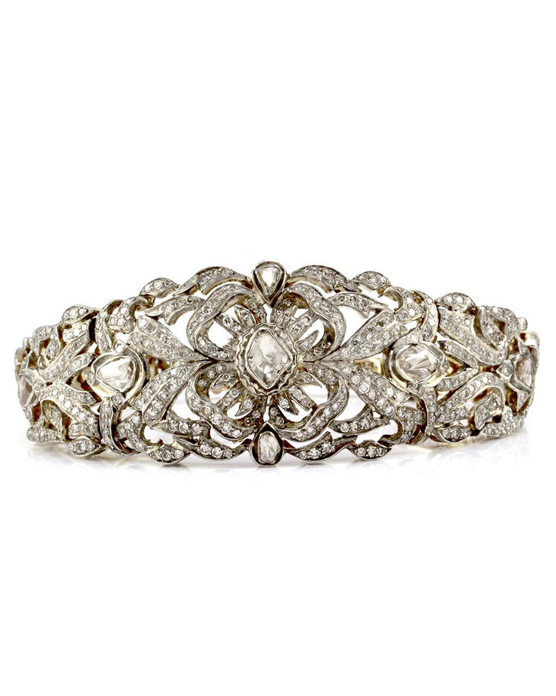 Edwardian Rose & Single Cut Diamond Bracelet in 14K Yellow Gold & Silver