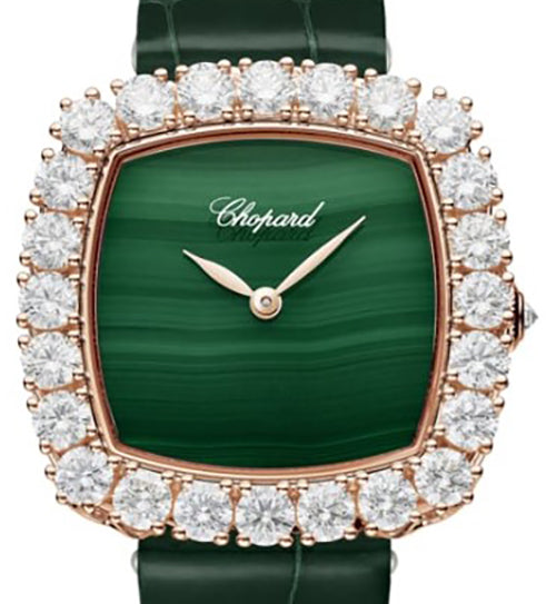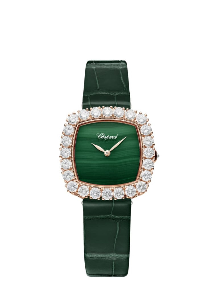 2025 Model Chopard L'Heure Du Diamant Cushion 36 mm Watch - Ref: 13A196-5500 - Green Dial in 18k Rose Gold Case, Green Leather Strap