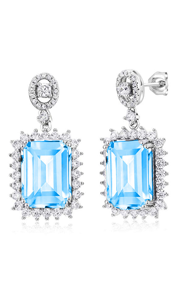 Blue Topaz Emerald Cut Pave Drop Earrings