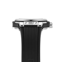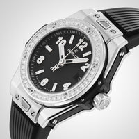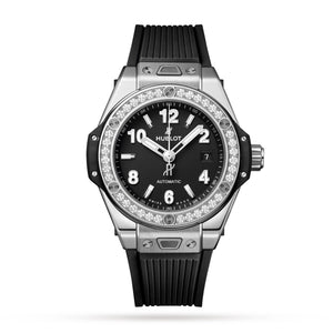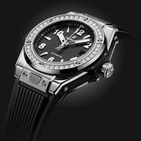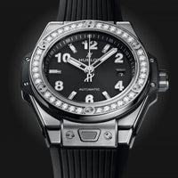 Big Bang One Click 33s – notable sophistication Presented in a 33mm polished stainless steel case Stainless steel bezel set with 36 glistening diamonds Stylish matte black dial with 11 diamond hour markers Powered by the HUB1120 self-winding movement for flawless precision CAPTURING THE SPIRIT OF INDEPENDENCE The Big Bang collection has undoubtably revolutionised the watchmaking universe – bringing together extraordinary design elements that never fail to make an impact. A unapologetic contemporary icon, this range is constantly evolving in line with technological and aesthetic advances. The One Click model is no exception, with its statement features and luxurious finishes. STATEMENT STYLE MEETS FLAWLESS PERFORMANCE The epitome of statement design, this striking model boasts a bold black dial with 11 glistening diamond-set hour markers and date display positioned at 3 o’clock. The 33mm polished stainless steel case is enhanced by a further 36 diamonds set in the stainless steel bezel. Powered by the HUB1120 self-winding movement with a 40-hour power reserve, this extraordinary timepiece is water resistant to 10 bar (100 metres) and fastens securely with a black, structured lined rubber strap with an 18K King gold and titanium deployant buckle clasp.