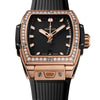 Spirit of Big Bang- an updated design Presented in an elegant 32mm 18K King gold case Polished 18K King gold bezel set with 44 diamonds for effortless radiance Understated matte black dial allows the diamonds to take centre stage Powered by the HUB1120 self- winding movement ELEGANCE REINVENTED Hublot has adapted the elegant spirit of Big Bang to create an exclusive barrel shaped collection that offers clever multi-layer construction, and countless combinations of striking materials, colours, and finishes. Fusing tradition and innovation, the Spirit of Big Bang collection pushes boundaries to unleash the extraordinary. LUXURIOUS KING GOLD AND GLISTENING DIAMONDS Designed to move with precision, this wonderfully elegant model is presented in a 32mm 18K King gold case framed by an 18K King gold bezel set with 44 glistening diamonds for enhanced radiance. Allowing the diamonds to take centre stage, the matte black dial is distinctly understated, with King gold hands and hour markers, and a subtle date display at 6 o’clock. Secured with a black structured rubber strap, this high performance watch is powered by the HUB1120 self-winding movement. Additional functionality is provided by a 40-hour power reserve and water resistance to 10 bar (100 metres).