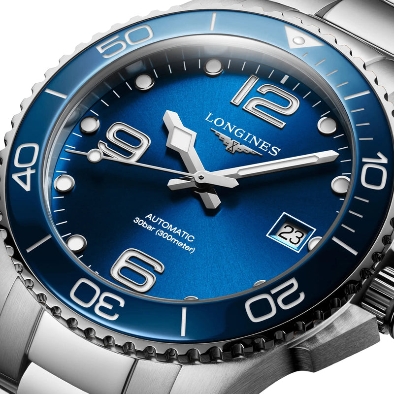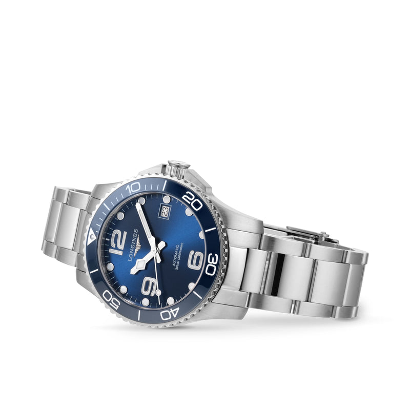 Combining elegance and performance Featuring a captivating sunray blue dial housed in a 39mm stainless steel case Equipped with a grey ceramic unidirectional rotating bezel and screw-in crown Powered by the precise Calibre L888 automatic movement with a 72-hour power reserve Water-resistant to 30 bar (300 meters) DESIGNED FOR AQUATIC ADVENTURE Since 1832, Longines has excelled in blending elegance with exceptional performance. With a rich history rooted in precision and sophistication, Longines remains a trusted choice for explorers and athletes seeking reliable timekeeping. This legacy is clear in the Longines Sport Collection. The HydroConquest series embodies the brand's commitment to merging advanced technology with stylish design. Crafted in a case size suitable for both men and women, these watches are engineered for high performance in challenging environments, while maintaining a refined aesthetic. SOPHISTICATED INNOVATION With its 39mm case presented in stainless steel with matching bracelet, this Longines HydroConquest timepiece exemplifies both durability and elegance. Framed by a grey ceramic unidirectional rotating bezel, the sunray blue dial showcases applied Arabic numerals and indexes, paired with silvered polished hands treated with Swiss Super- LumiNova® for clear visibility in any light. With a 3 o'clock date window and water resistance up to 30 bar (300 meters), this watch is both practical and stylish. Designed for those who demand performance and sophistication, the HydroConquest is driven by the automatic Calibre L888 movement, offering a powerful and reliable timekeeping experience.