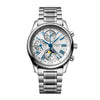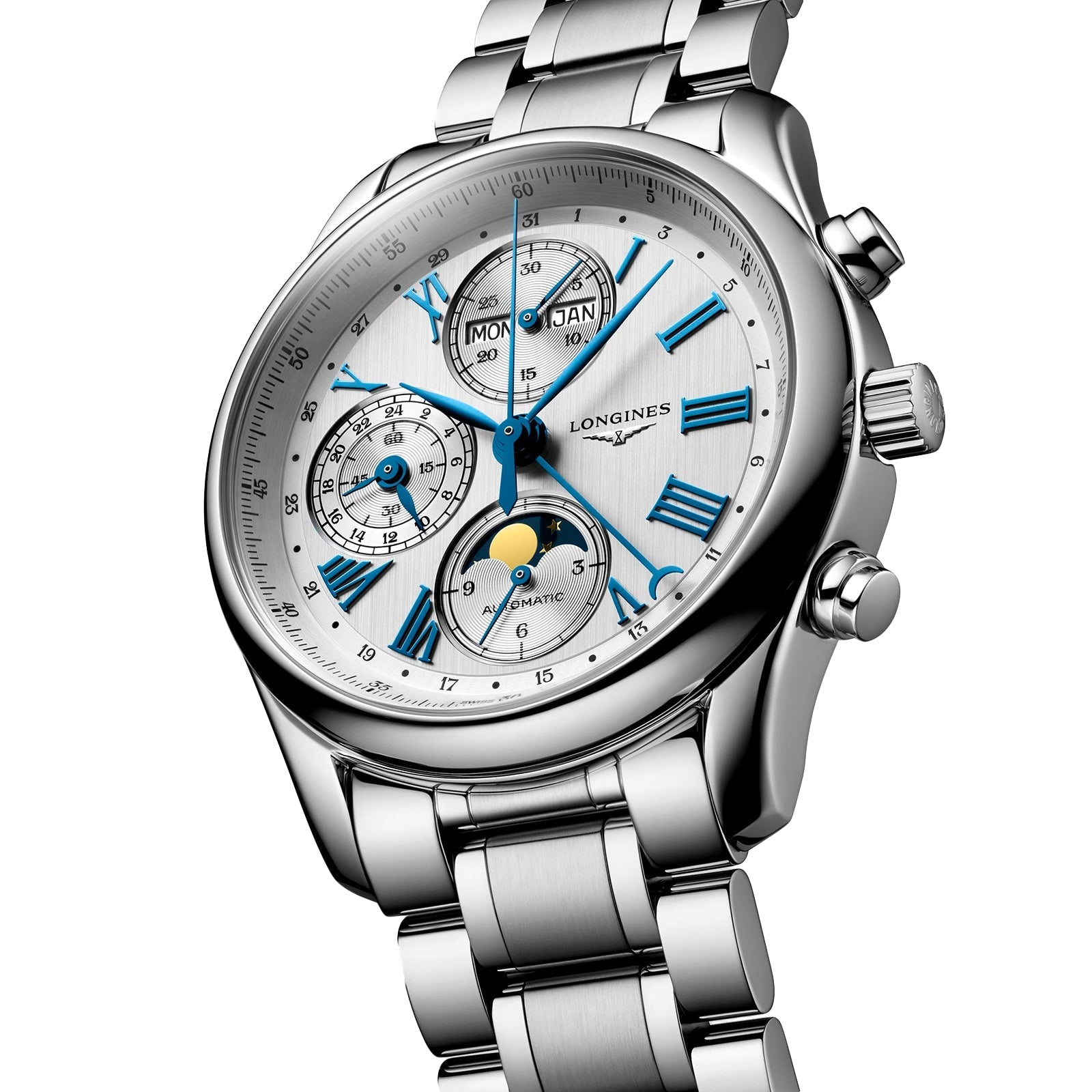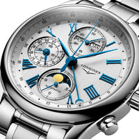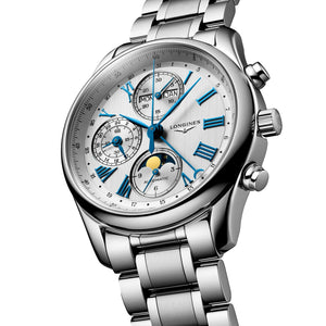 Longines Master Collection - classic sophistication with modern functionality Silver dial with applied Roman numerals and distinctive blued steel hands Housed in a 40mm stainless steel case with a matching bracelet Driven by the L687 Calibre automatic movement with a 66-hour power reserve Moonphase display at 6 o'clock with date indicated by central half-moon hand ENGINEERED WITH PRECISION Since the beginning, Longines has been defined by a pioneering spirit, a relentless quest for precision, and a timeless vision of elegance. This legacy has made Longines a preferred choice for renowned pioneers and sports organisations worldwide, who seek the brand's esteemed timepieces and expert timekeeping. Combining classic design with modern craftsmanship, the Master Collection embodies Longines' legacy of expertise. Each watch in the collection reflects the brand's dedication to creating exceptional timepieces that blend historical sophistication with contemporary functionality, making them a symbol of excellence and reliability. A QUIET SENSE OF LUXURY This sophisticated watch features a striking silver dial adorned with applied Roman numerals, complemented by blued steel hands that add a unique touch of colour and refinement. Crafted from stainless steel with a transparent sapphire crystal case back, this 40mm timepiece seamlessly blends style with functionality. The silver barleycorn dial offers an array of features, including a moon phase display at 6 o'clock and a date indicated by a central half-moon hand. The chronograph mechanism, with its column wheel and sub-dials for 12-hour and 30-minute counters, ensures precision in every function, whilst the blued steel hands enhance the overall aesthetic. With a self-winding mechanical movement that boasts a 66-hour power reserve, this watch stands as a testament to the brand's dedication to both excellence and innovation. Water-resistant up to 3 bar, it is designed to withstand daily adventures while maintaining a timeless elegance.