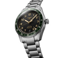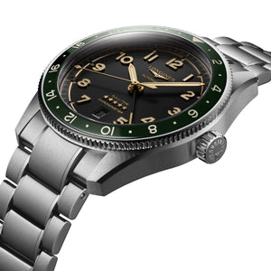 Inspired by the brand’s rich heritage 42mm stainless steel case with a co-ordinating bracelet Anthracite dial framed by a green ceramic bezel 24 hours hand with time zone mechanism Powered by the L844.4 calibre movement A RICH HERITAGE Inspired by a rich heritage, the Longines Spirit timepieces provide a touching tribute to the courageous men and women who left their mark on the world, encouraging new generations to push limits and surpass themselves. The Spirit collection embraces the strong pioneering spirit that has influenced Longines since the earliest days. With present-day aesthetics and technical requirements, this collection captures the essence of history with modernised details. STRIKING FINISH A chronometer certified by COSC, this 42mm stainless steel model is powered by the exclusive Longines L844.4 calibre movement. The striking anthracite dial is framed by a deep green ceramic bezel and features gold polished hands, applied Arabic numerals, and a 24 hour hand with time zone mechanism. Presented on a stainless steel bracelet with a double safety folding clasp, this timepiece includes 72 hours of power reserve and water resistance up to 10 bar (100 metres).