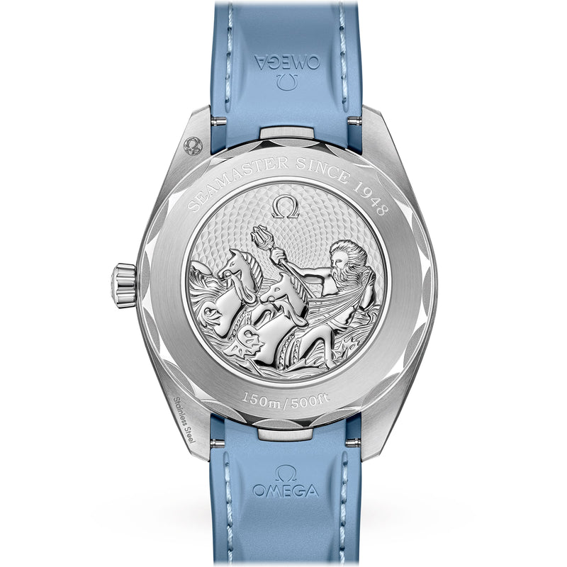 Seamaster Aqua Terra - a tribute to Omega's rich maritime legacy Teak pattern dial in Summer Blue with a gradient finish Water resistant to 15 bar (150 metres) 41mm stainless steel case paired with an integrated blue rubber strap Master chronometer certified by METAS INSPIRED BY LUXURY SAILBOATS A tribute to Omega's rich maritime heritage, the Seamaster Aqua Terra collection balances technical sophistication and ocean spirit. The 150m models offer a refreshing new look, with clean aesthetics, a new symmetrical case design, and Master Chronometer movements with extraordinary levels of magnetic resistance. These timepieces are further characterised by a teak patterned dial, inspired by the wooden decks of luxury boats. ATTENTION TO DETAIL This 41mm watch is presented in a symmetrical, stainless steel case, paired with an integrated blue rubber strap. The Summer Blue teak pattern dial is sun-brushed, PVD-treated and varnished with a gradient, and features rhodium-plated hands and indexes filled with a unique light blue Super-LumiNova, and a date window at 6 o'clock. Power and precision are delivered by the Co-Axial Master Chronometer 8900 calibre movement, certified at the highest level by the Swiss Federal Institute of Metrology (METAS).