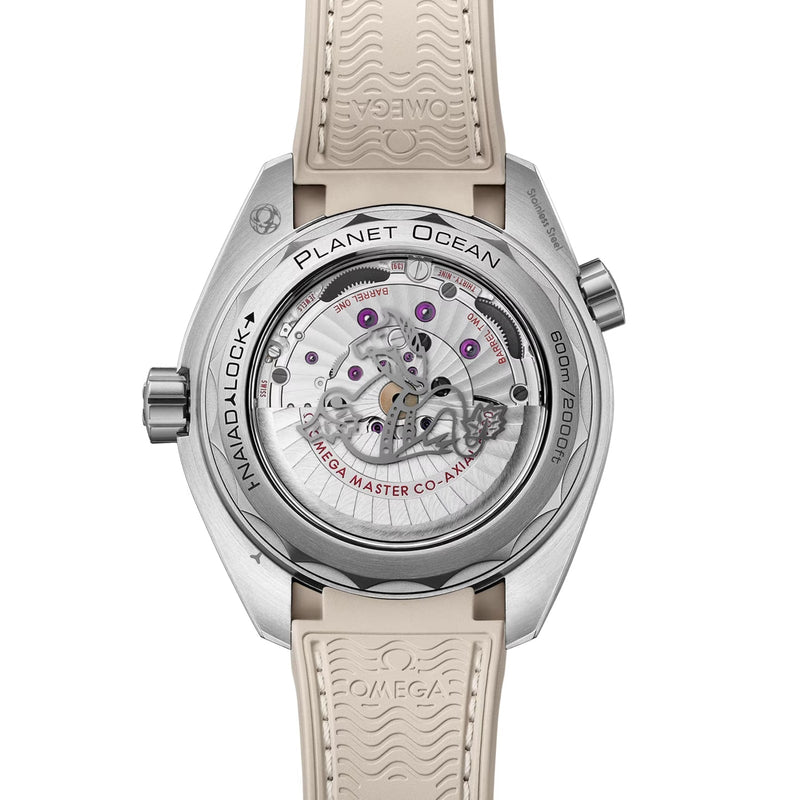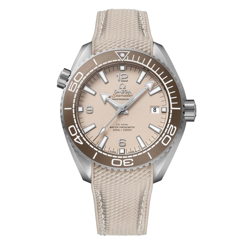 Planet Ocean - a celebration of Omega's dive watch legacy Seamaster heritage driven by the Co-Axial Master Chronometer calibre 8900 movement Water resistant to 60 bar (600 metres) Housed in a 43.5mm brushed stainless steel case paired with a beige rubber strap Sand-blasted beige dial framed by a brushed bronze silicon nitride ceramic bezel ring DESIGNED FOR DIVERS Introduced in 2005, the Planet Ocean 600m collection pays tribute to the brand's ocean heritage with modern design, creative touches, and revolutionary Master Chronometer movements. Designed to meet the unique needs of divers, this updated range is equipped with Super-LumiNova coated indexes for visibility underwater, as well as water resistance to 60 bar (600 metres). UPDATED STYLE AND ADVANCED PRECISION This 43.5mm watch features a sand-blasted beige varnished dial with a date window at 3 o'clock, Arabic numerals, hands, and hour makers in PVD grey with a brushed finish. The classic brushed stainless steel case is paired with an integrated beige rubber strap with a structured pattern and white stitching. Power and precision are delivered by the Co-Axial Master Chronometer calibre 8900 movement, which can be seen through the transparent, sapphire crystal case back.