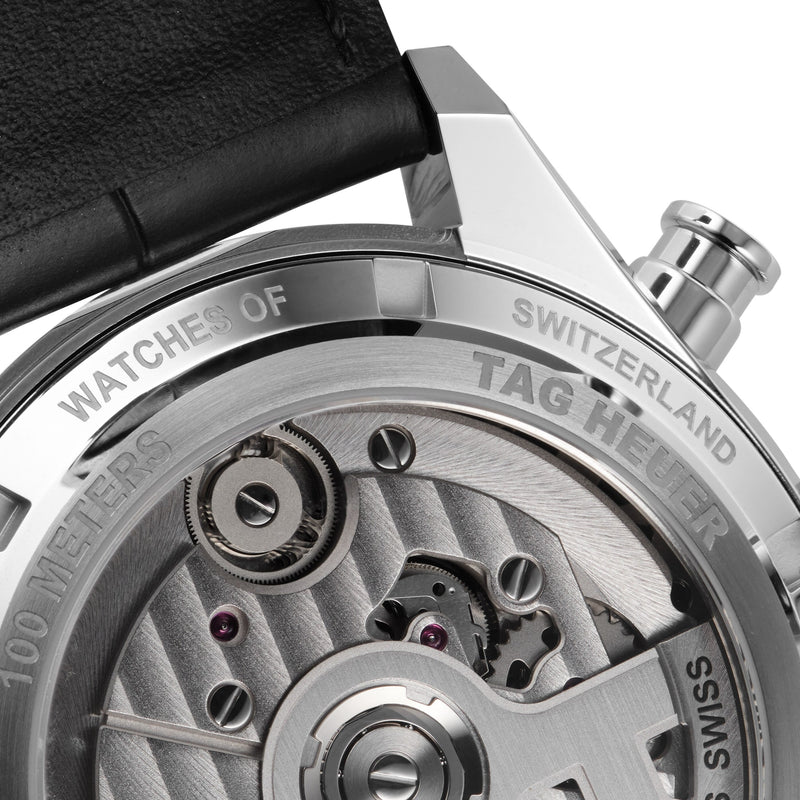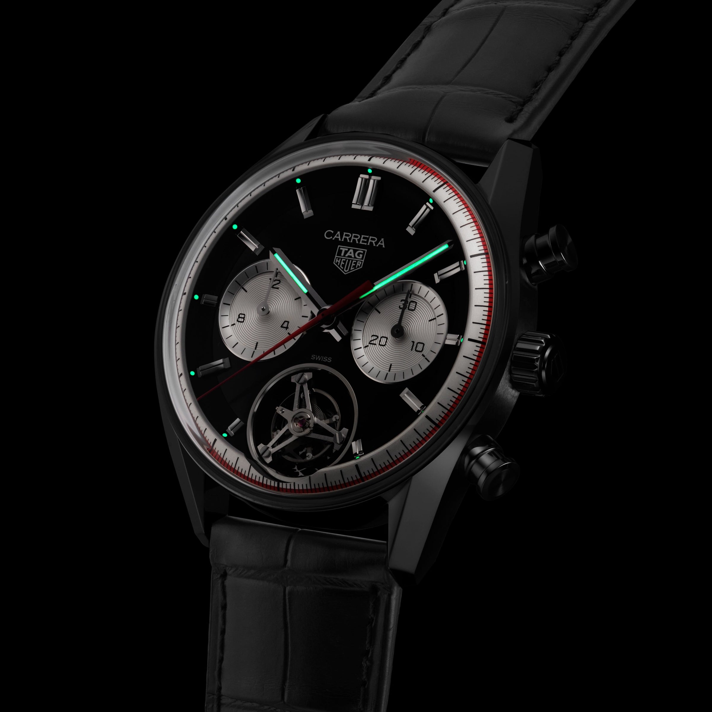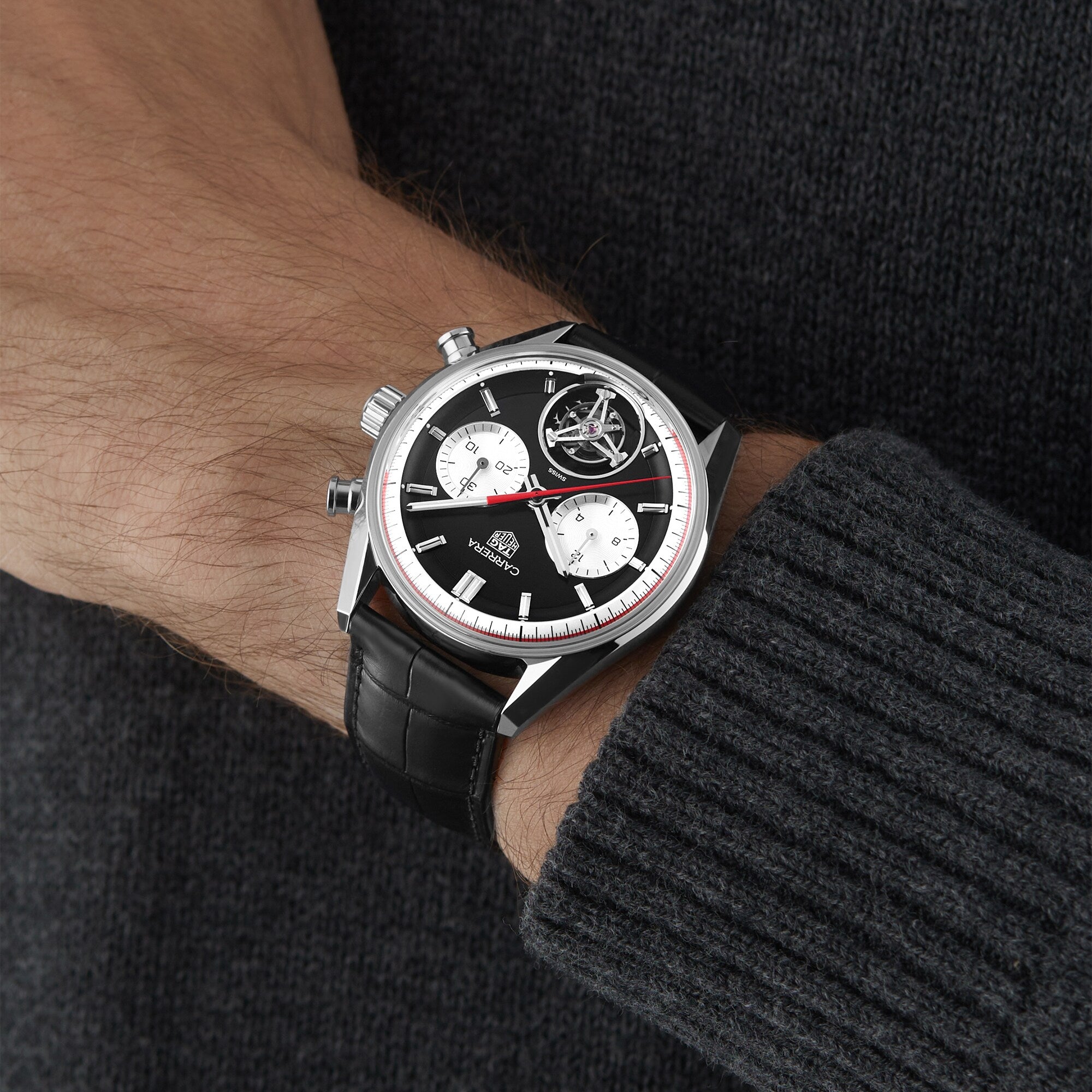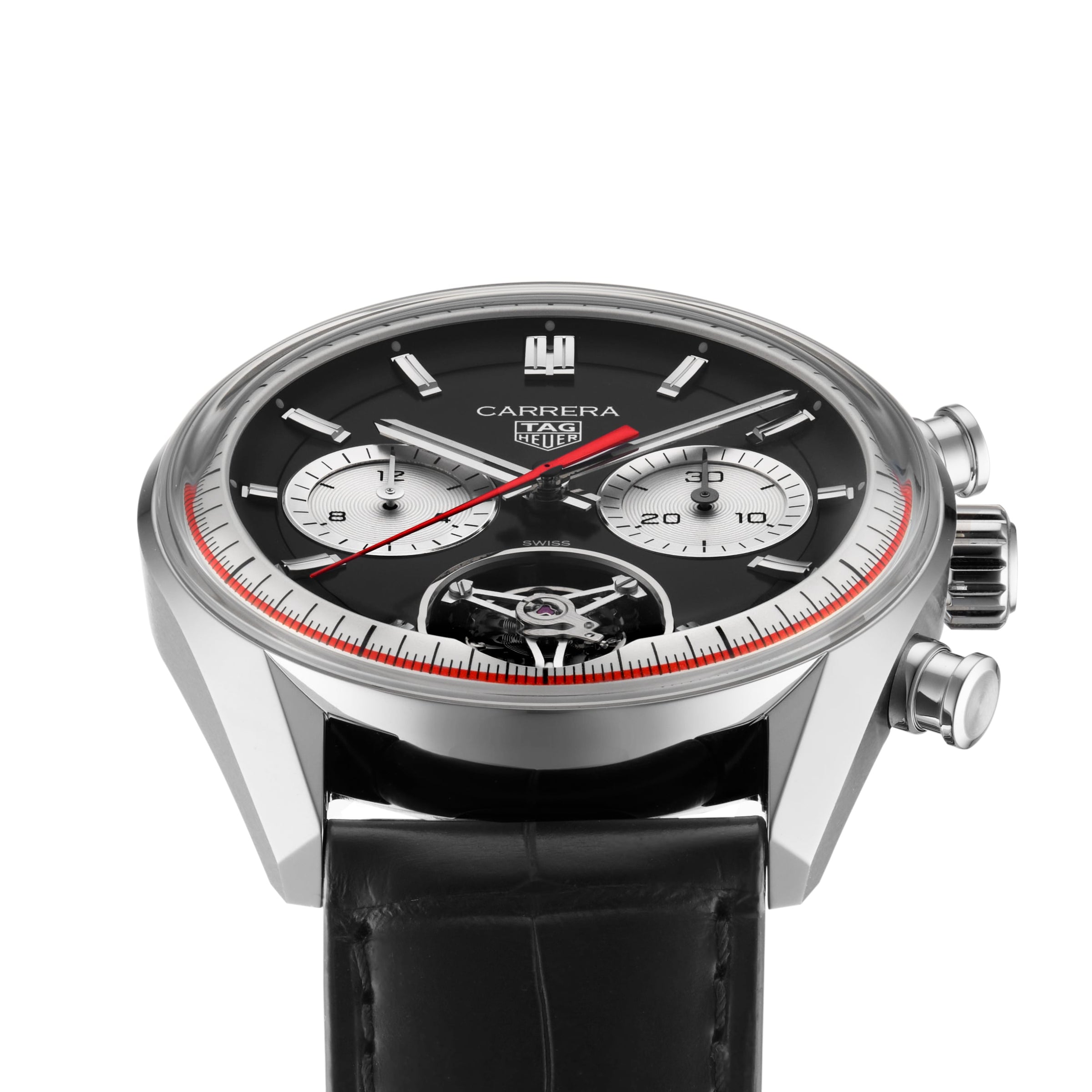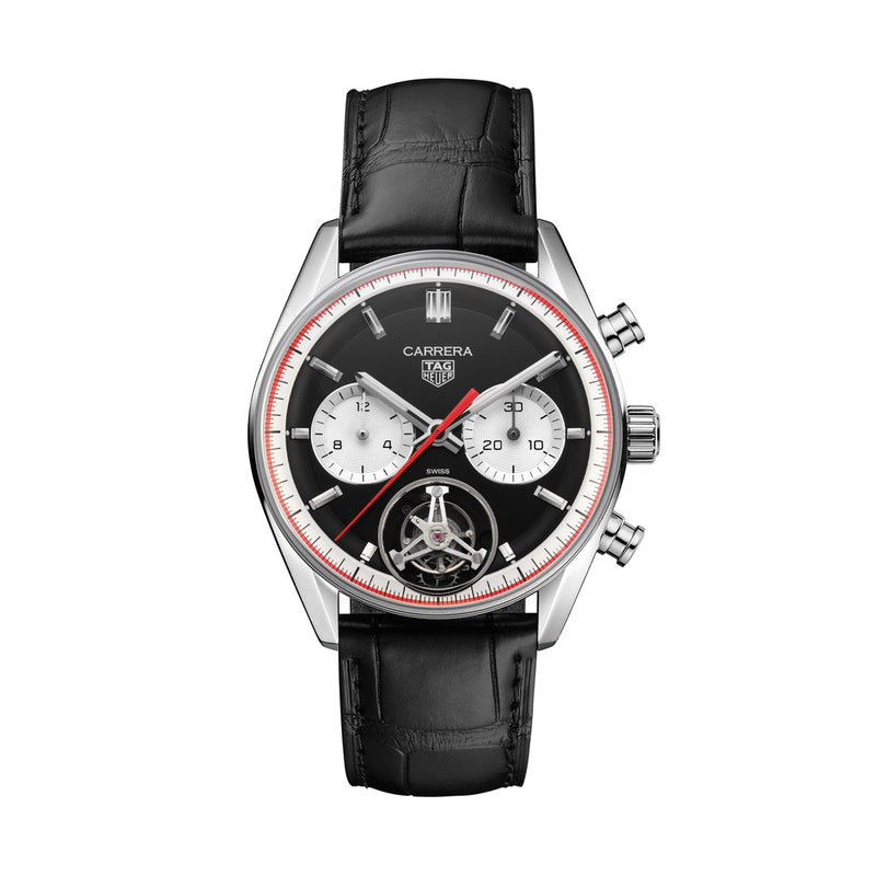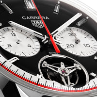 Exclusive Carrera tourbillon to celebrate the centenary of the Watches of Switzerland Group Elegant tourbillon timepiece evoking the golden age of motorsport TAG Heuer Carrera chronograph with inverse panda' dial and sporty red accents 65hr power reserve and 100m water resistance 42mm case Stainless steel case with black alligator leather strap Exclusive 10 Pieces made worldwide. CENTENARY TOURBILLON Exclusive to the Watches of Switzerland Group, and created in collaboration with the high horology experts at TAG Heuer, this chronograph tourbillon perfectly encapsulates the racing spirit of the luxury Swiss brand. Evoking the golden age of racing with its black 'inverse panda' dial and alligator leather strap, this luxury timepiece brings it home with striking red accents to the flange and hour hand. The TAG Heuer Centenary Tourbillon is the perfect new entry in the high-octane Carrera family, proudly associated with the hundred-year history of the Watches of Switzerland. HIGH HOROLOGY, VINTAGE AESTHETICS Indelibly associated with all forms of sports, TAG Heuer has been deeply involved with motorsport since Jack Heuer took over the family business in the late 1950's. The exclusive collaboration with the Watches of Switzerland honours this deep legacy with nods to the golden age of racing including the red accents encircling the chapter ring and the matching hour marker. Invented in 1795, the tourbillon complication is often seen as the pinnacle of luxury watchmaking, representing both technical and aesthetic achievement. TAG Heuer's take on this stunning movement, comprised of 59 precisely machined and hand assembled parts, is a thing of beauty and accuracy. The TH20-09 movement is chronometer certified by COSC, highlighting its precision and durability. Sporting a deep, 65hr power reserve and water resistance to 100m, the tourbillon movement is visible through both the aperture on the front of the watch and the sapphire caseback, all encased in stainless steel. · Exclusive Carrera tourbillon to celebrate the centenary of the Watches of Switzerland Group · Elegant tourbillon timepiece evoking the golden age of motorsport · TAG Heuer Carrera chronograph with 'inverse panda' dial and sporty red accents · 65hr power reserve and 100m water resistance · 42mm case Stainless steel case with black alligator leather strap CENTENARY TOURBILLON Exclusive to the Watches of Switzerland, and created in collaboration with the high horology experts at Tag Heuer, this chronograph tourbillon perfectly encapsulates the racing spirit of the luxury Swiss brand. Evoking the golden age of racing with its black 'inverse panda' dial and alligator leather strap, this luxury timepiece brings it home with striking red accents to the flange and hour hand. The TAG Heuer Centenary Tourbillon is the perfect new entry in the high- octane Carrera family, proudly associated with the hundred-year history of the Watches of Switzerland. HIGH HOROLOGY, VINTAGE AESTHETICS Indelibly associated with all forms of sports, TAG Heuer has been deeply involved with motorsport since Jack Heuer took over the family business in the late 1950's. The exclusive collaboration with the Watches of Switzerland honours this deep legacy with nods to the golden age of racing including the red accents encircling the chapter ring and the matching hour marker. Invented in 1795, the tourbillon complication is often seen as the pinnacle of luxury watchmaking, representing both technical and aesthetic achievement. TAG Heuer's take on this stunning movement, comprised of 59 precisely machined and hand assembled parts, is a thing of beauty and accuracy. The TH20-09 movement is chronometer certified by COSC, highlighting its precision and durability. Sporting a deep, 65hr power reserve and water resistance to 100m, the tourbillon movement is visible through both the aperture on the front of the watch and the sapphire caseback, all encased in stainless steel.